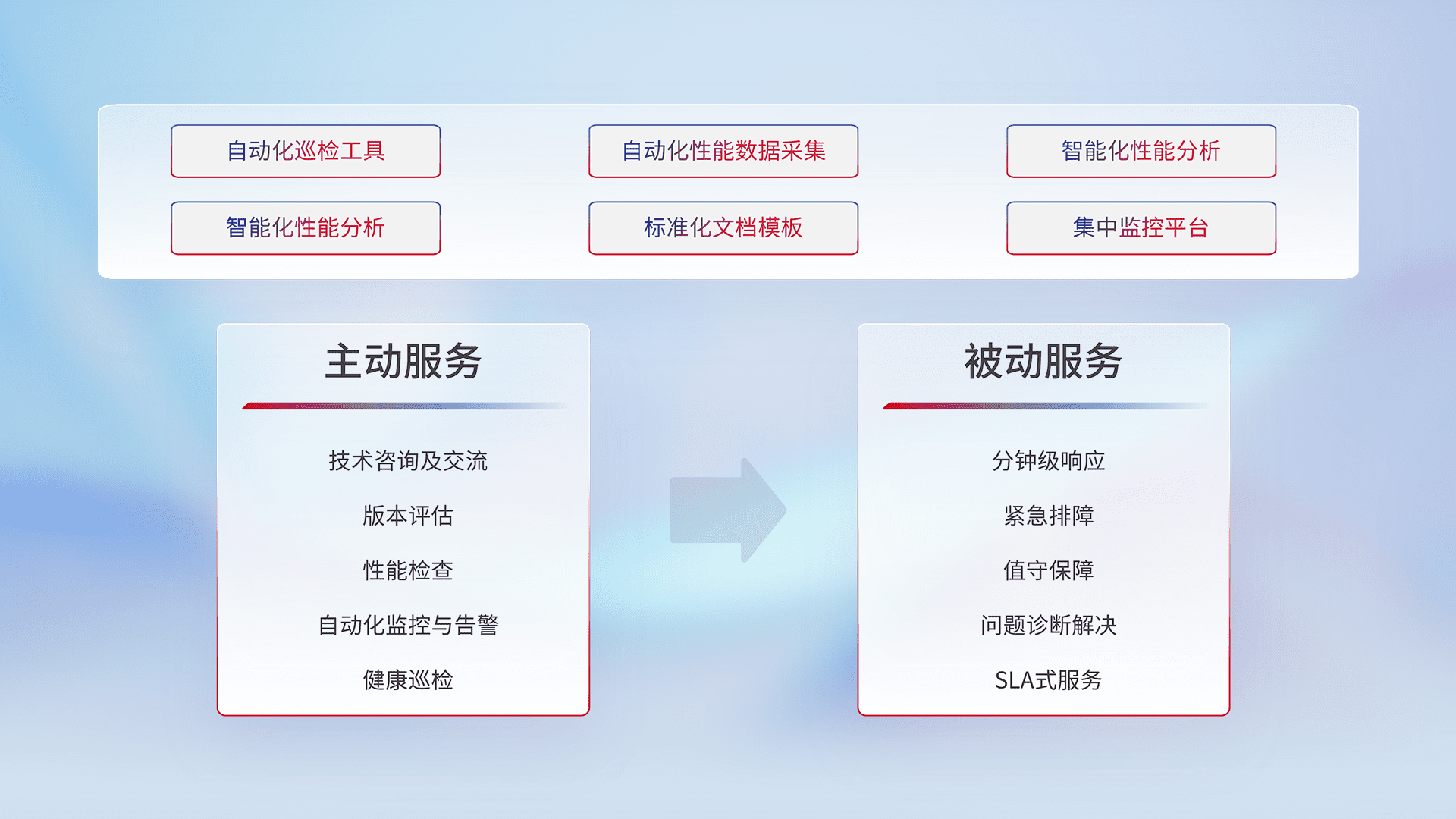 智能化工具和标准化文档,,保障服务质量,,,提供主动服务(包含技术咨询、、、版本评估、、性能检查、、自动化监控与告警、、、健康巡检)和被动服务包含(分钟级响应、、、、紧急排障、、、值守保障、、问题诊断解决、、SLA服务)。。。。